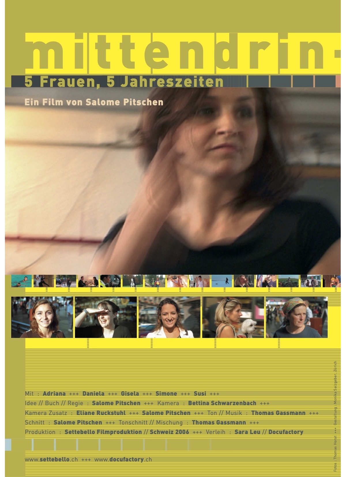 "mittendrin – 5 Frauen, 5 Jahreszeiten" ist eine poetische Studie über das Lebensgefühl von fünf Frauen aus dem Raum Zürich. Filmemacherin Salome Pitschen begleitet sie 15 Monate lang in ihrem Alltag und erforscht auf einfühlsame Weise deren Suche nach einem stimmigen Lebensweg - inmitten des Dschungels unzähliger Möglichkeiten, Modeströmungen und gesellschaftlicher Normen.